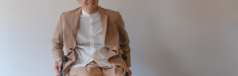 Dawn" means daybreak, rising of the curtain, or beginning.When you wear a jacket, you may feel uncomfortable or find it difficult to move around.This "Dawn Jacket" is characterized by its ease of wear and ease of movement, even for those who do not like such jackets.The arm opening is designed to be wide enough to allow even those with limited arm and shoulder movement to easily slip the sleeves through. Wide gussets on the sides allow smooth movement around the shoulders, making the jacket less tiring to wear.The back is in a raglan style to facilitate daily arm forward movement, such as when working at a desk, washing hands, or moving by wheelchair.In addition, to prevent the chest area from sagging or wrinkling when sitting, the buttons are positioned higher than usual, and the vent, a cutout in the back of the jacket, was purposely not made to maintain a smart silhouette."