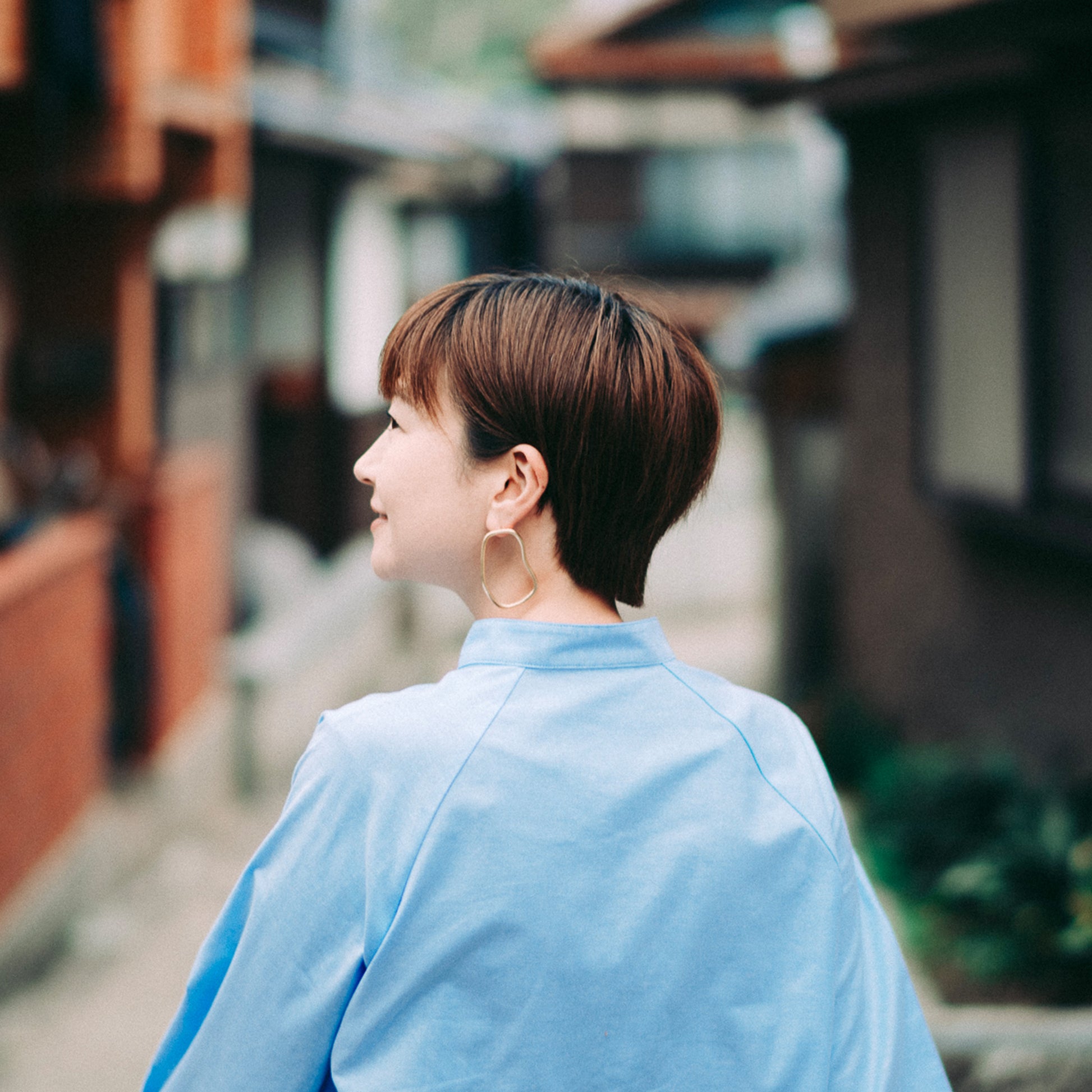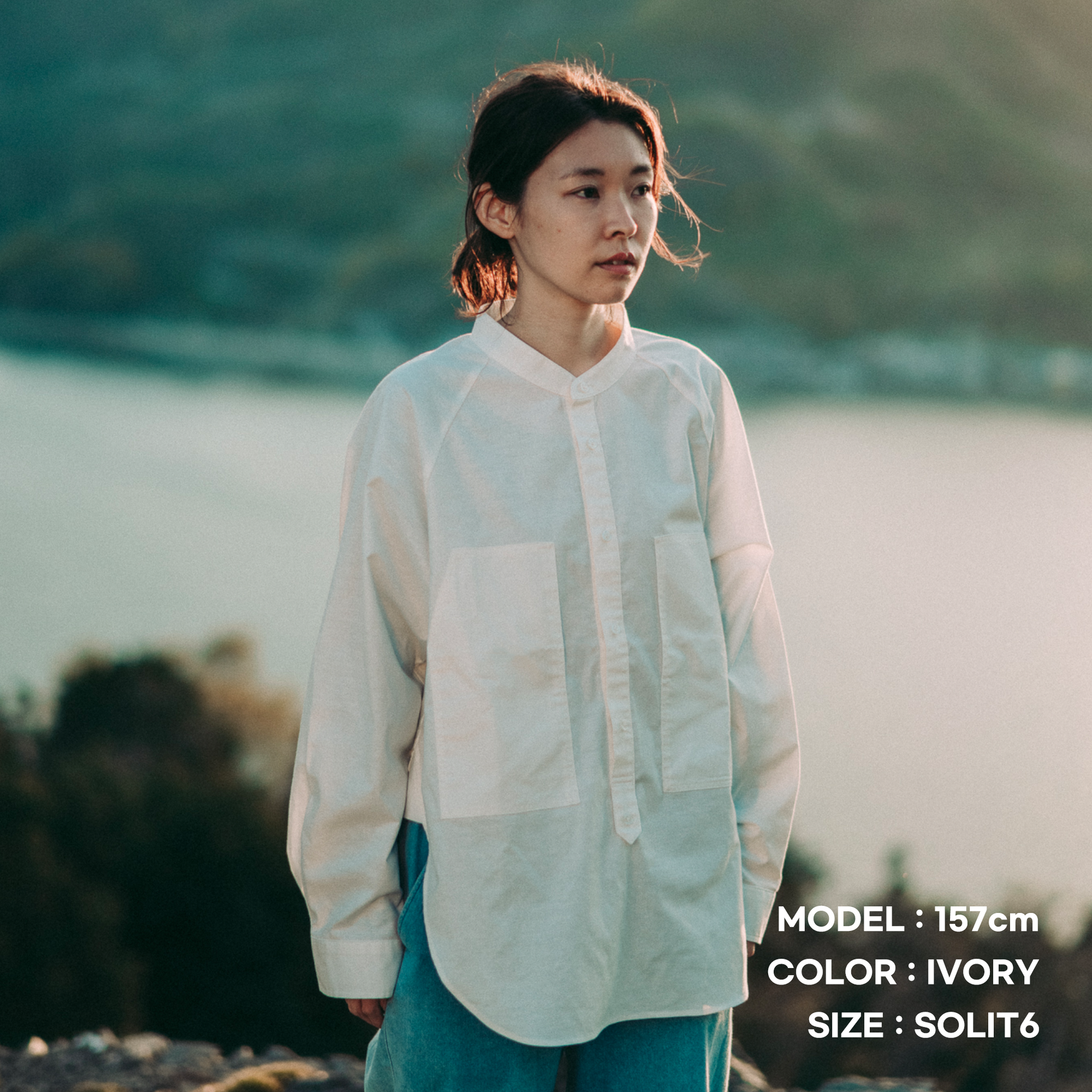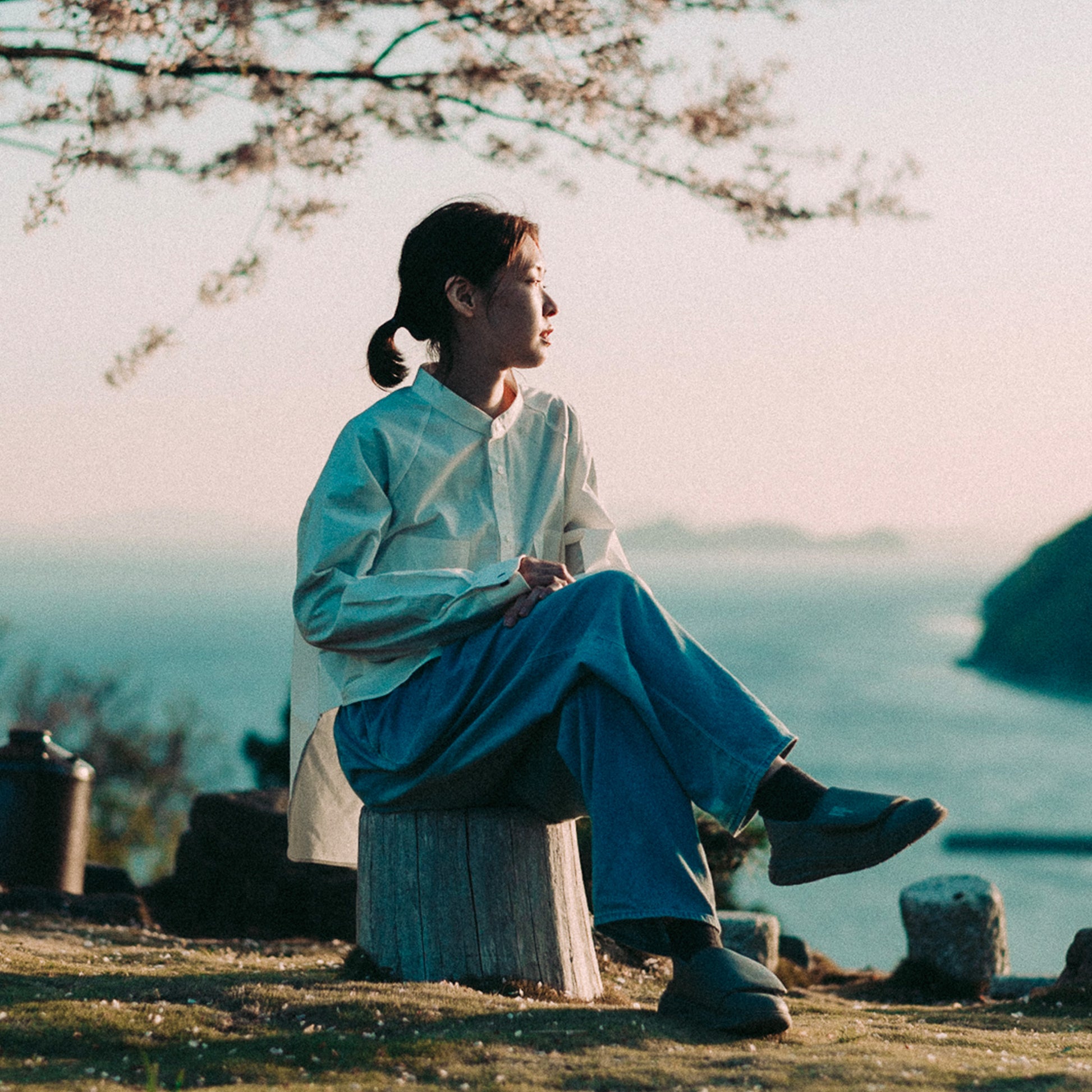 "Thought" is made of a polyester/cotton blend. It has a raglan design that does not stick out around the shoulders, magnetic buttons that are easy to attach and detach even with one hand, and deep side slits to increase the range of motion and create a beautiful form that does not leave excess fabric around the stomach even in the sitting position.