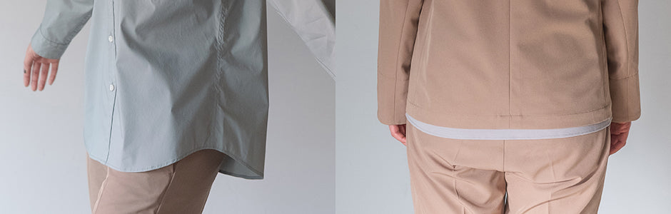 定番シャツの裾の「ラウンドボトム」も、少し短めの設計にしています。座っても邪魔にならず、シワも目立ちにくいつくりです。ストレートボトムよりは少し長めの丈なので、パンツインスタイルが多い方などにおすすめです。